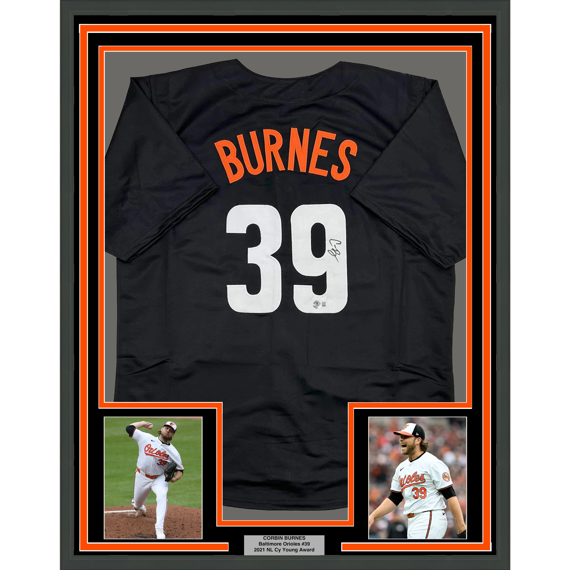 Framed Autographed/Signed Corbin Burnes 35x39 Baltimore Black City Connect Baseball Jersey Beckett BAS COA