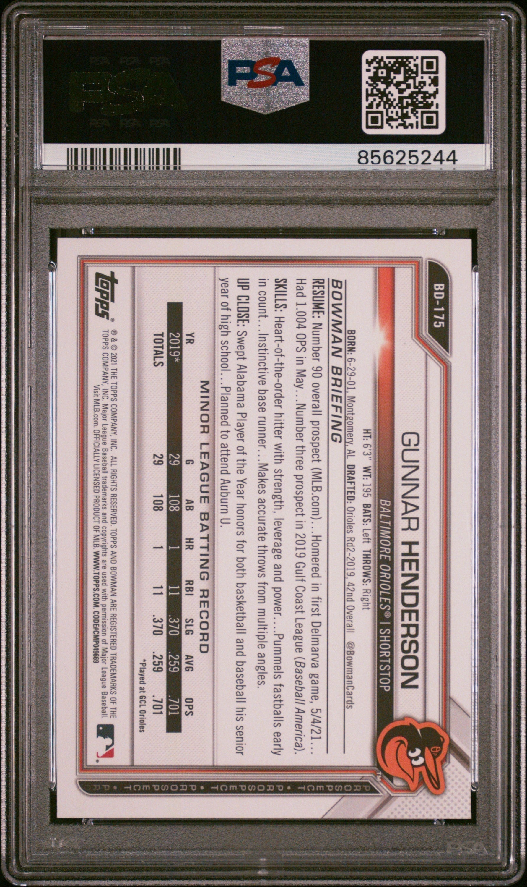 Graded 2021 Topps Bowman Draft Gunnar Henderson #BD175 Rookie RC Baseball Card PSA 9 Mint