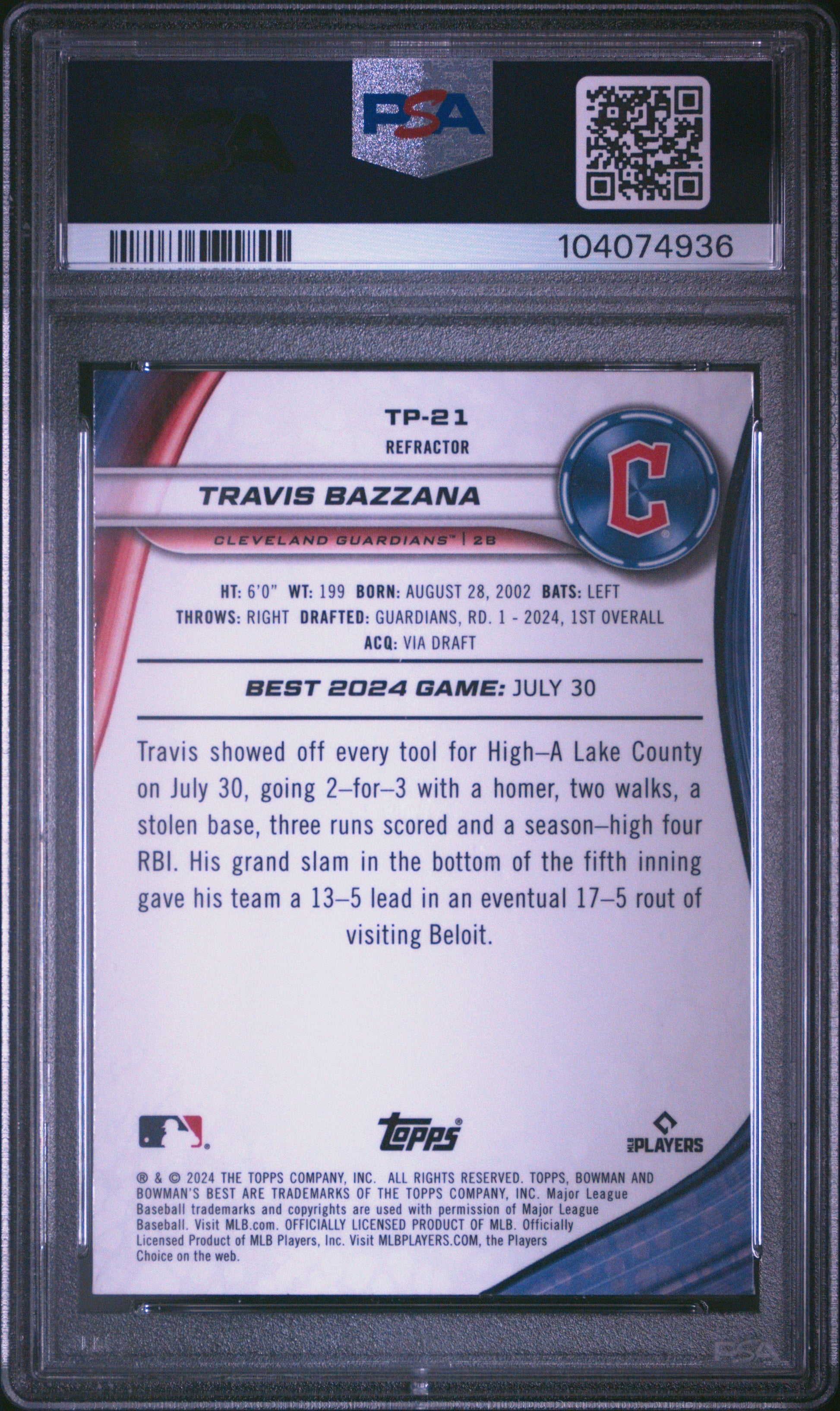Graded 2024 Topps Bowmans Best Travis Bazzana #TP21 Top Prospects Refractor Rookie RC Baseball Card PSA 10 Gem Mint