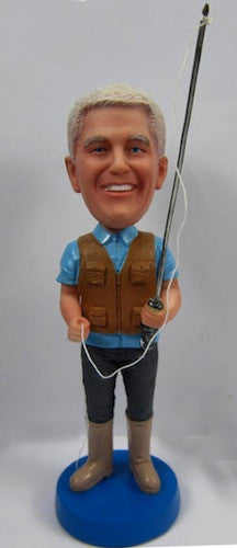 A male fisherman who is ready to catch some fish! He is ready to go with his fishing rod and rain boots.