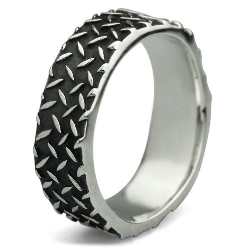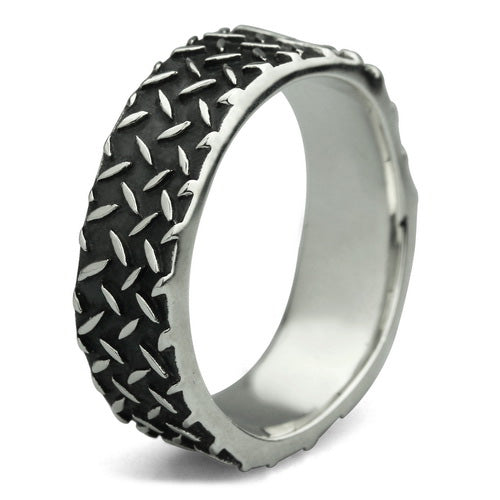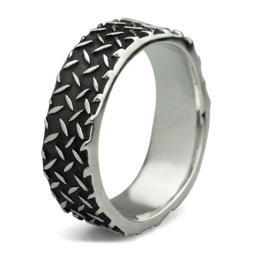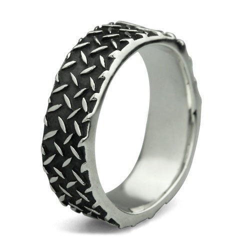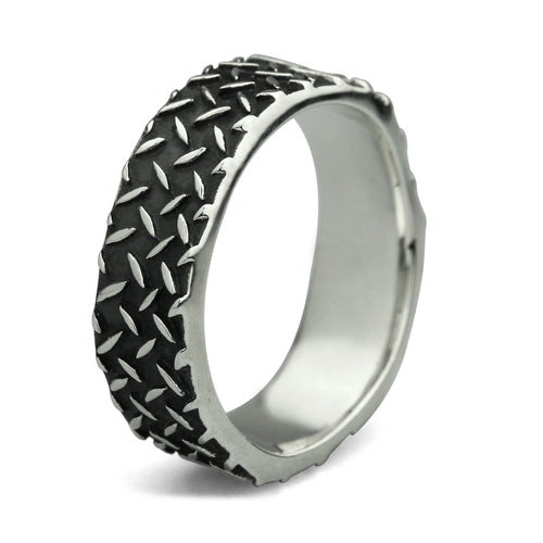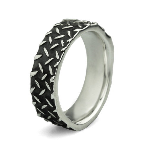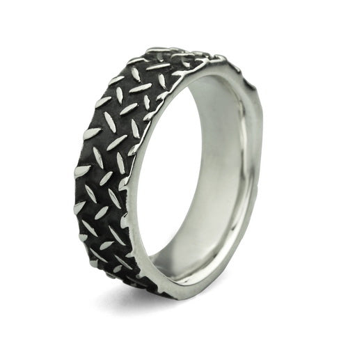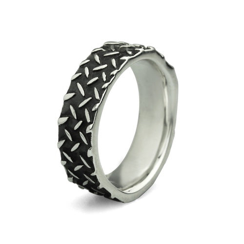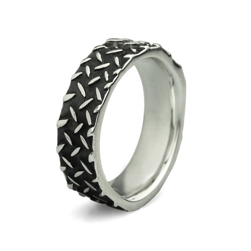 Cast in sterling silver with a textured tread of industrial edge, this ring echoes the grit of city steel and the rhythm of machinery in motion. Its darkened grooves and raised pattern speak to resilience, structure, and the unyielding spirit that shapes progress.
