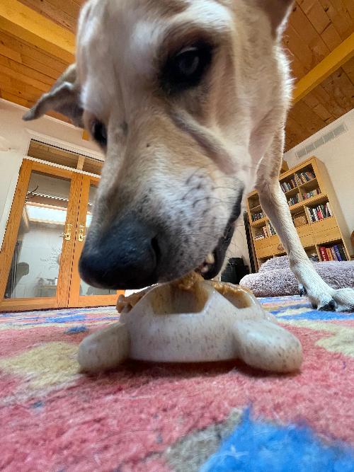 As an Enrichment Toy: Spread peanut butter, yogurt, cream cheese, or other soft treats into the grooves and ridges of the turtle's shell. This creates a puzzle-like challenge that keeps dogs engaged for extended periods while they work to lick out every bit of treat.
