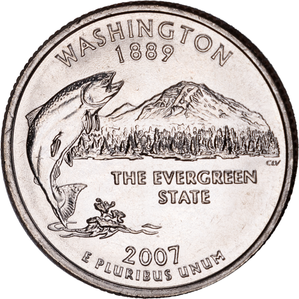 - Depicts Mt. Rainier overlooking a breaching salmon, along with the inscription THE EVERGREEN STATE beneath a line of trees at the mountain's base
