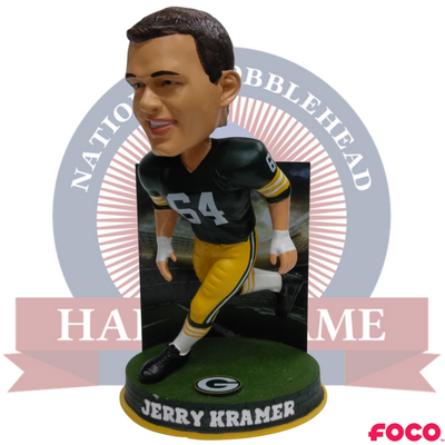 This bobblehead features Jerry Kramer. Jerry has been called the "Best Player Not in the Hall of Fame". It was produced exclusively for the National Bobblehead Hall of Fame and Museum and is officially licensed by the Green Bay Packers and the NFL.