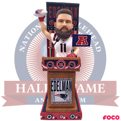 This bobblehead features Julian Edelman, former wide receiver for the New England Patriots. It is officially licensed by the New England Patriots and the NFL.