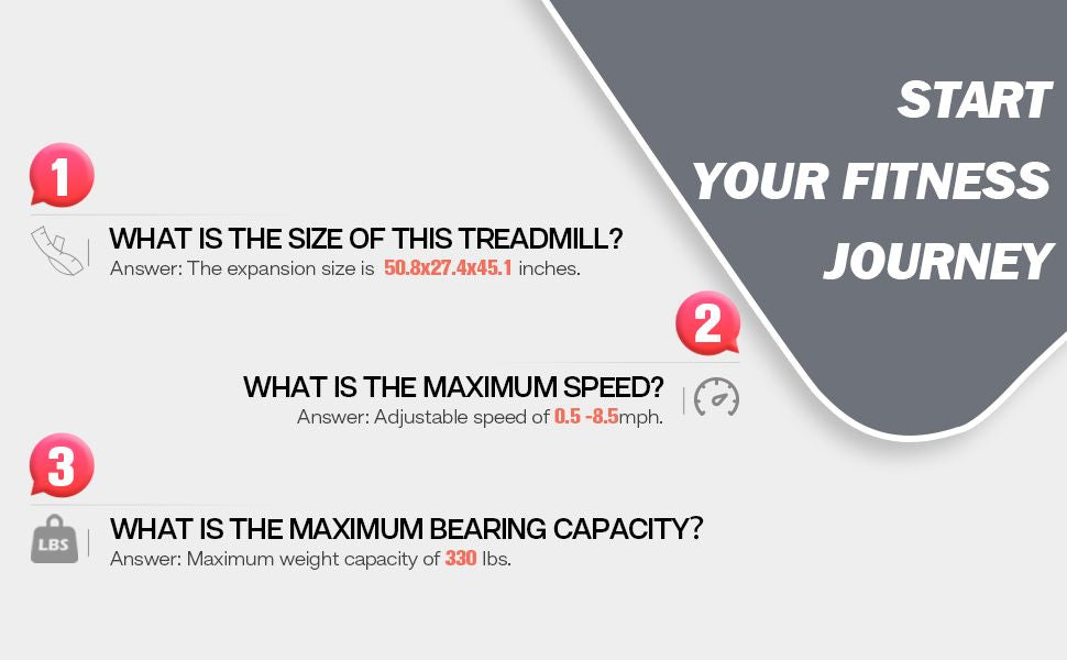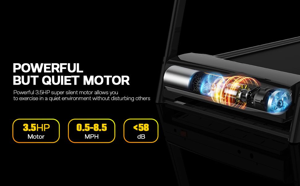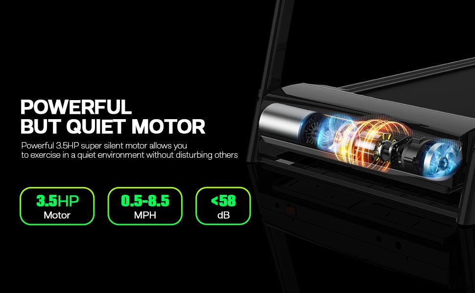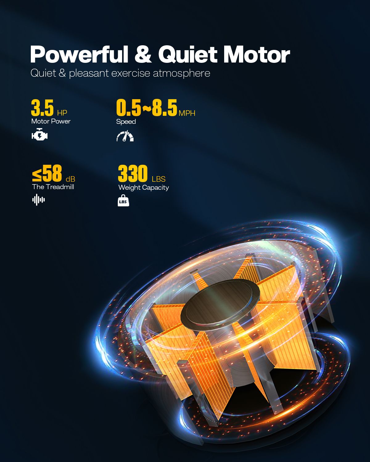 Powerful and Quiet Moto: This treadmill for home is equipped with a powerful 3.5 HP motor. It not only holds a 330 LBS capacity, but also up to 0.5-8.5 mph,