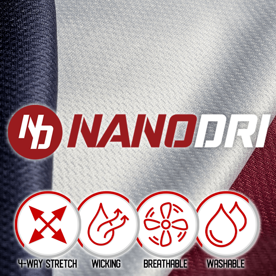 - Moisture-wicking, four-way stretch performance NanoDri Fabric