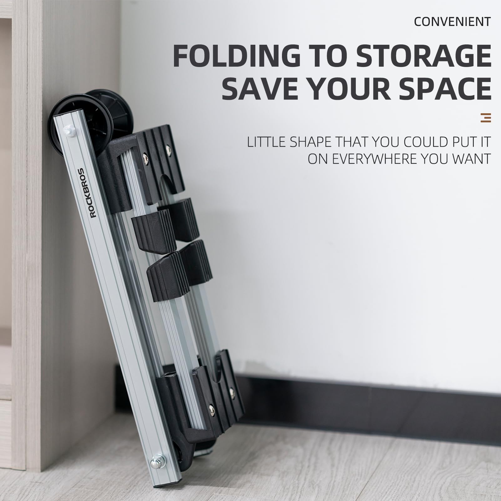 - ✔ CONVENIENT BICYCLE STORAGE: The foldable bicycle wheel holder consists of 5 folding systems, including one wheel stand and four rack stands. The bike stand can fold into a compact size of 17.77.44.7 inches for convenient storage when not in use.