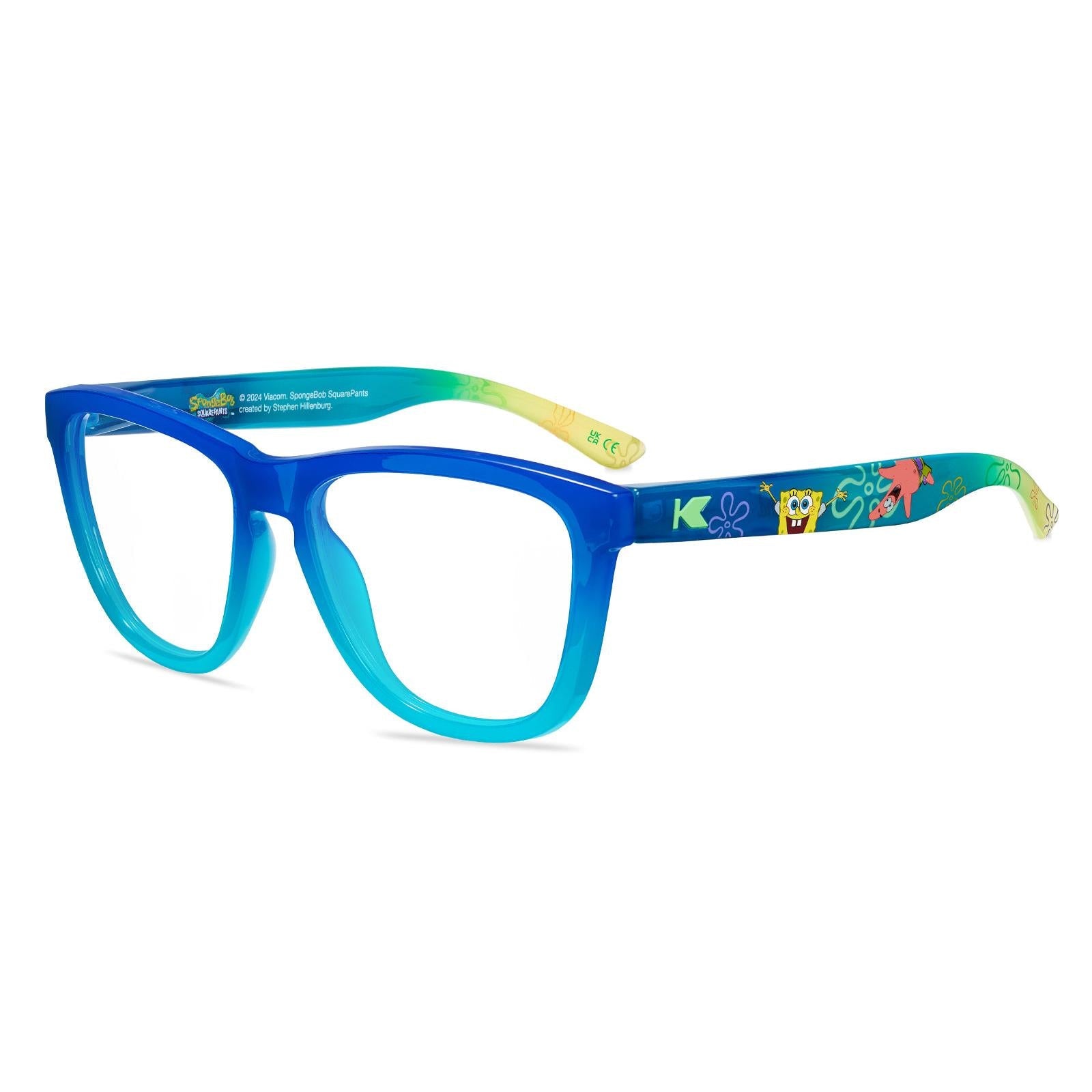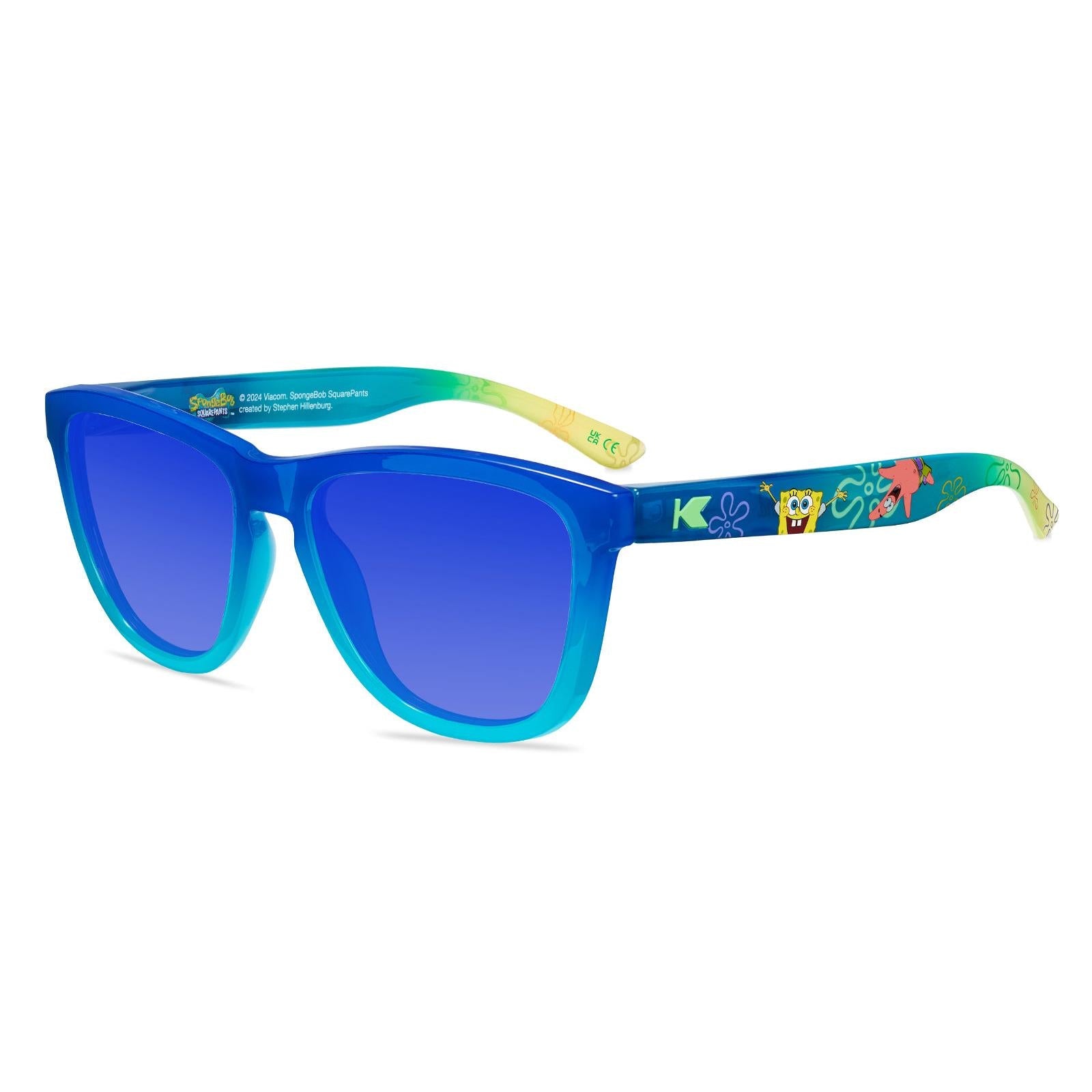 Who lives in a pineapple under the sea? These shades do now! The SpongeBob SquarePants Premiums take inspiration from the optimistically colorful world of Bikini Bottom. A deep sea fade frames polarized ocean sunrise lenses in the front, while each arm features SpongeBob and his BFF Patrick with Bikini Bottom’s iconic flower clouds in the background. Seafoam green K logos and a pineapple house lens etch round out this playful pair.