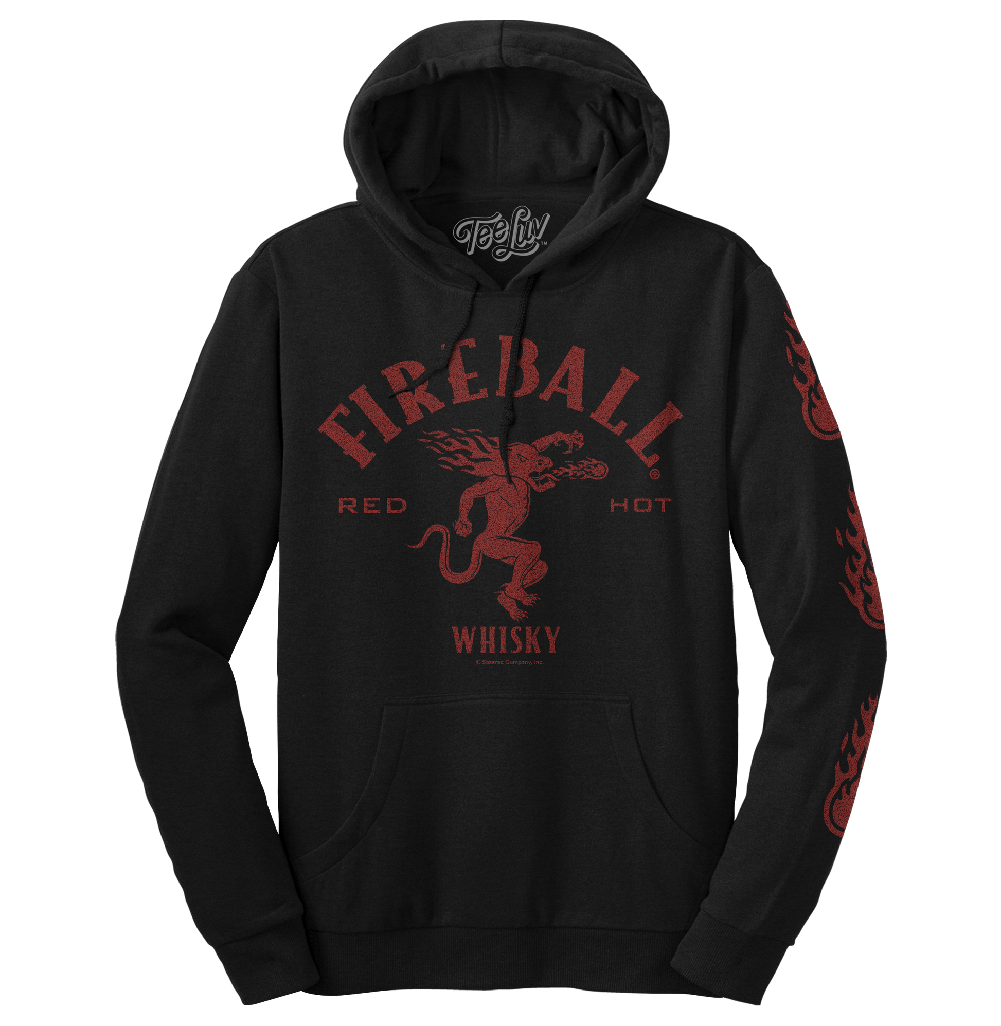 When it comes to delivering a bold and spicy twist, the world famous Fireball Cinnamon Whisky is always up to the challenge! We've paid tribute to the "Red Hot" concoction with an eye-catching hoodie of its very own featuring the lightly distressed Fireball Whisky dragon logo on the chest, along with striking red fireball graphics on the left sleeve. To ensure that you're always wrapped in warmth, this design is printed on a soft, poly-cotton black hooded sweatshirt.