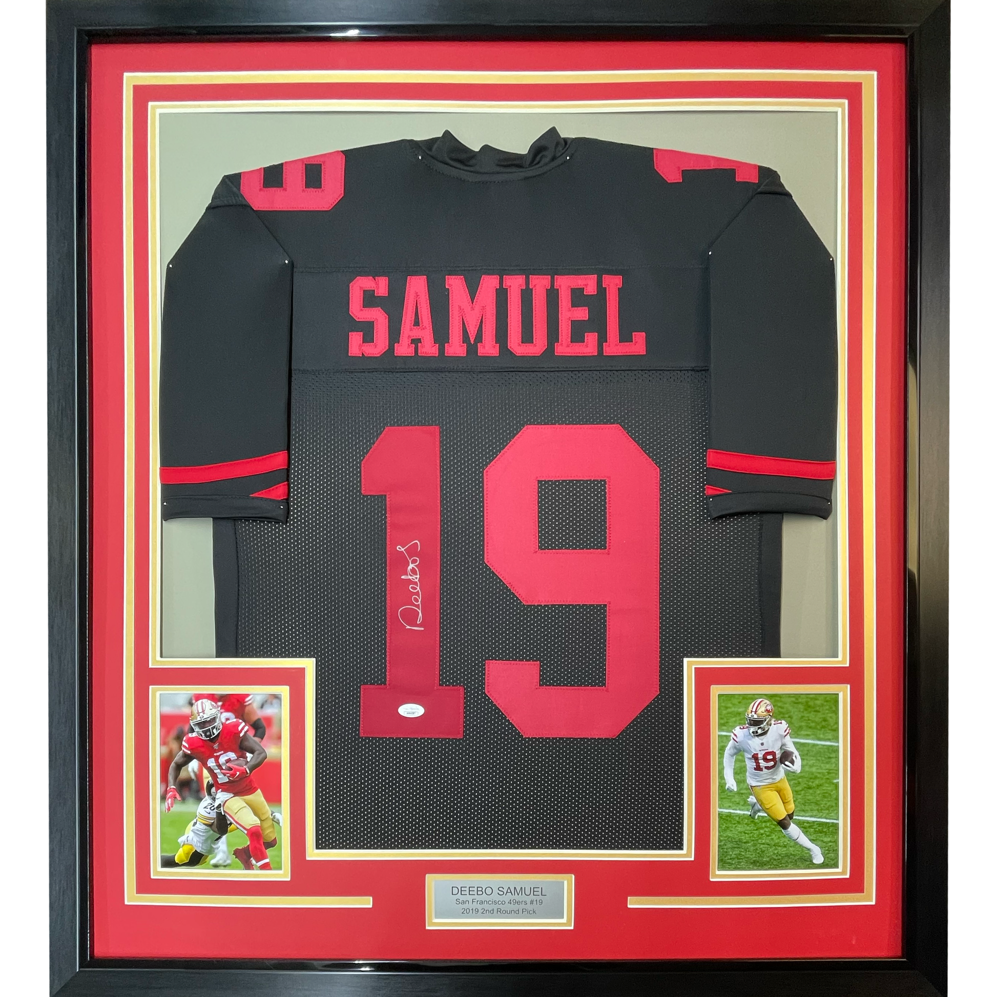 Framed Autographed/Signed Deebo Samuel 35x39 San Francisco Black Football Jersey JSA COA