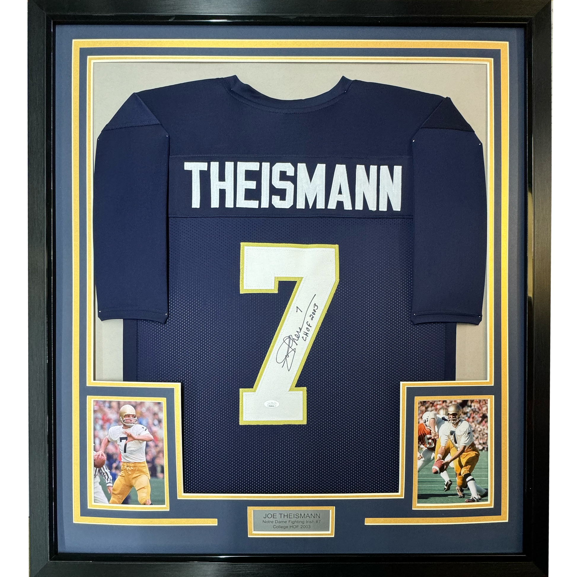 Framed Autographed/Signed Joe Theismann 35x39 CHOF 2003 Notre Dame Blue College Football Jersey JSA COA