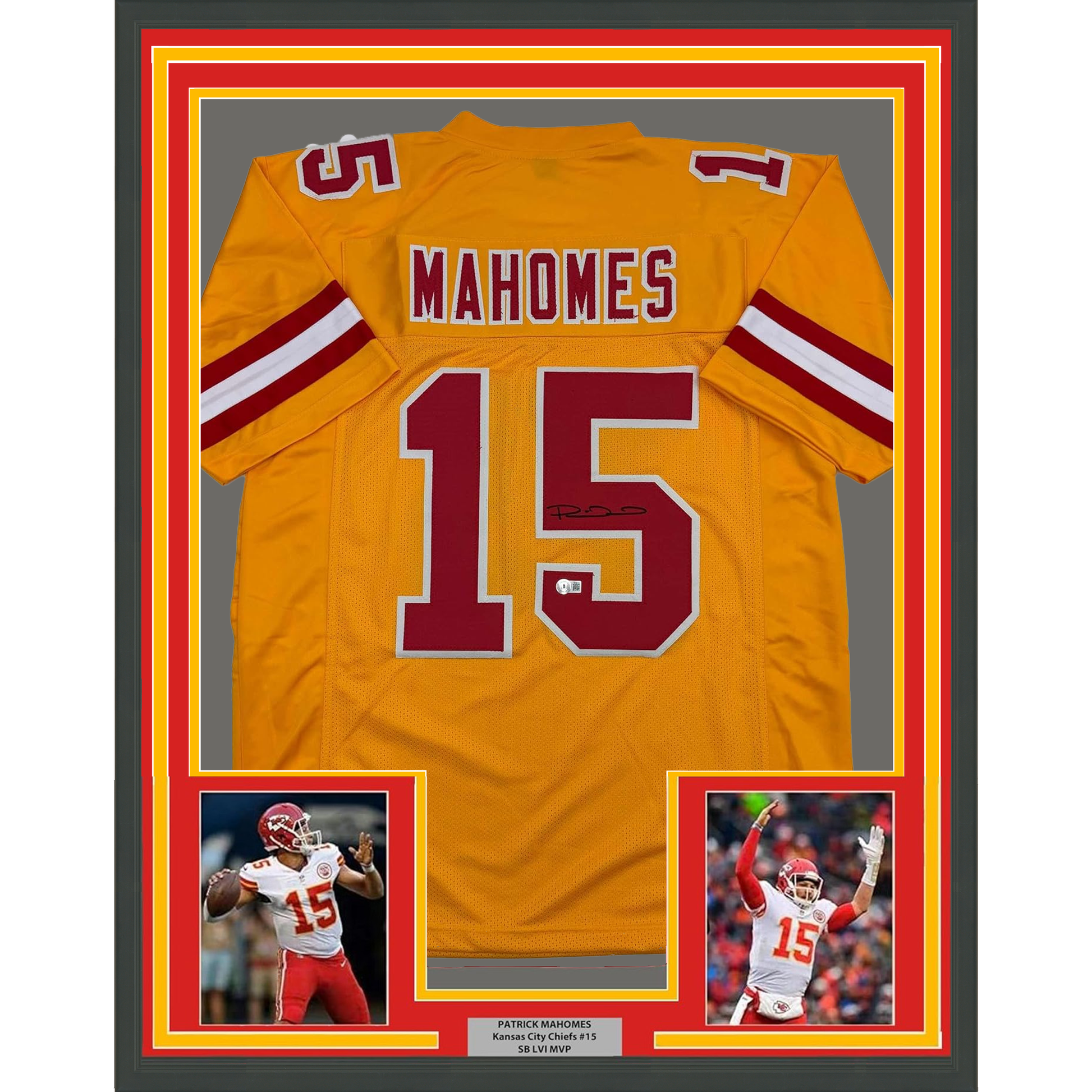 Framed Autographed/Signed Patrick Mahomes 35x39 Kansas City Yellow Football Jersey Beckett BAS COA