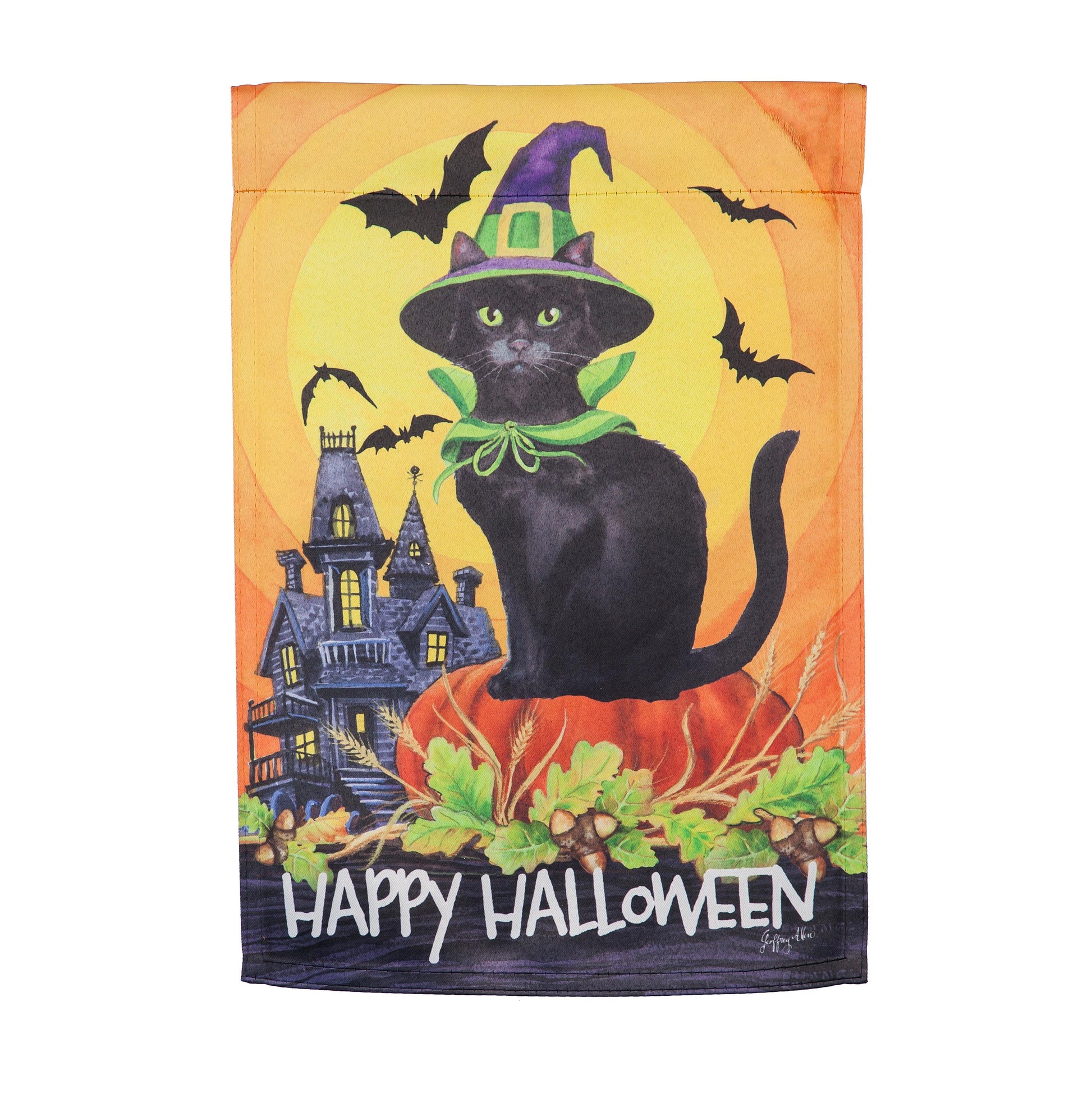 Wish guests, neighbors, and trick-or-treaters a Happy Halloween with this charming Halloween Black Cat suede garden flag. This garden flag features a black cat sitting on a pumpkin while wearing a witch hat. In the background, you will notice a haunted house surrounded by bats for an even scarier scene. Have some fun with your Halloween decor by displaying this thrilling design in your outdoor space. This Suede Reflections flag is made of medium-weight, polyester suede that provides a soft and durable texture. Artwork is heat transferred onto the sun-blocking material so that it is easily viewed from both sides. The weatherproof poly-suede will not fray or fade with continued outdoor use. The brilliant colors make any Suede Reflections flag the perfect addition to your garden or yard. This flag features a sleeve for use with any standard flagpole or stand, sold separately.