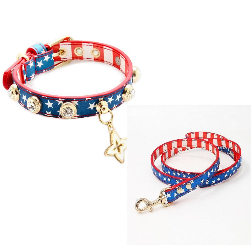 Show off your pet's patriotic spirit with this stylish American flag-themed pet collar, perfect for small and medium-sized dogs. The red, white, and blue design features stars and stripes, paired with dazzling rhinestone accents and gold-tone charms, making it the ideal accessory for special occasions like Independence Day or everyday wear. Crafted from durable materials, this collar is both comfortable and adjustable, ensuring the perfect fit for your pet. Whether you're celebrating a national holiday or just want to give your dog a fashionable look, this collar will make your pet stand out.