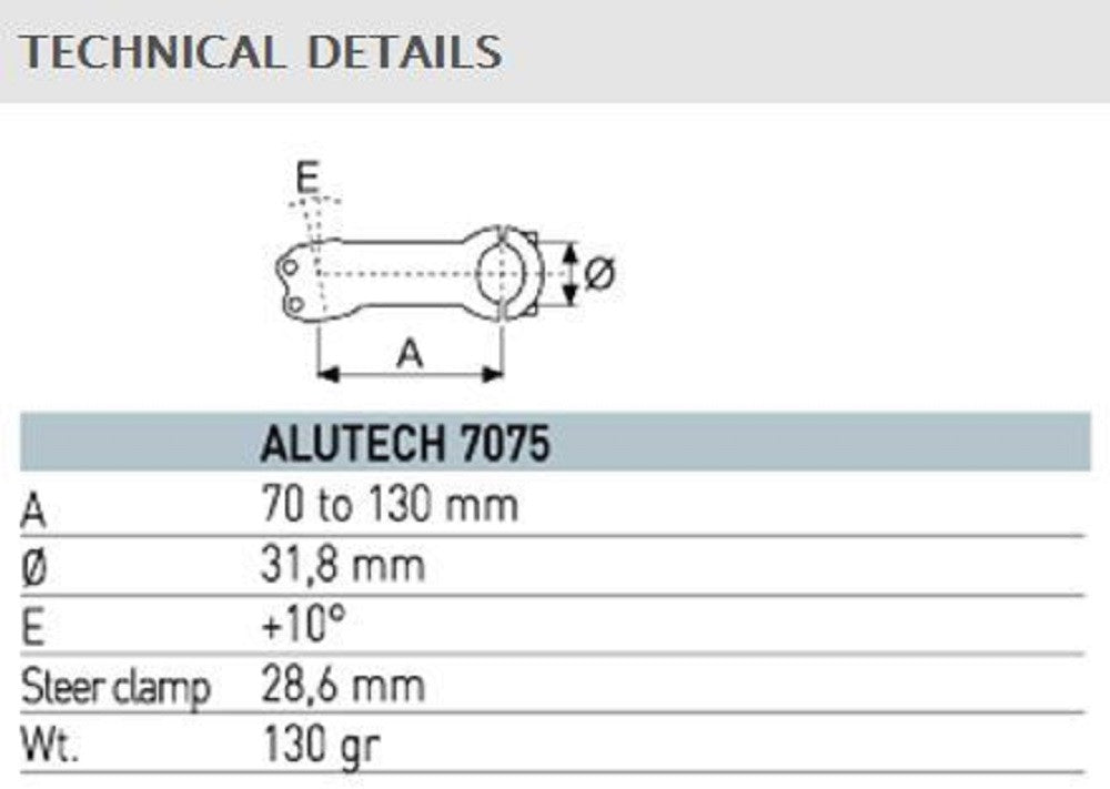 The 7075 stem has a 10 degree + or - drop, with a handle bar clamp size of 31.8.