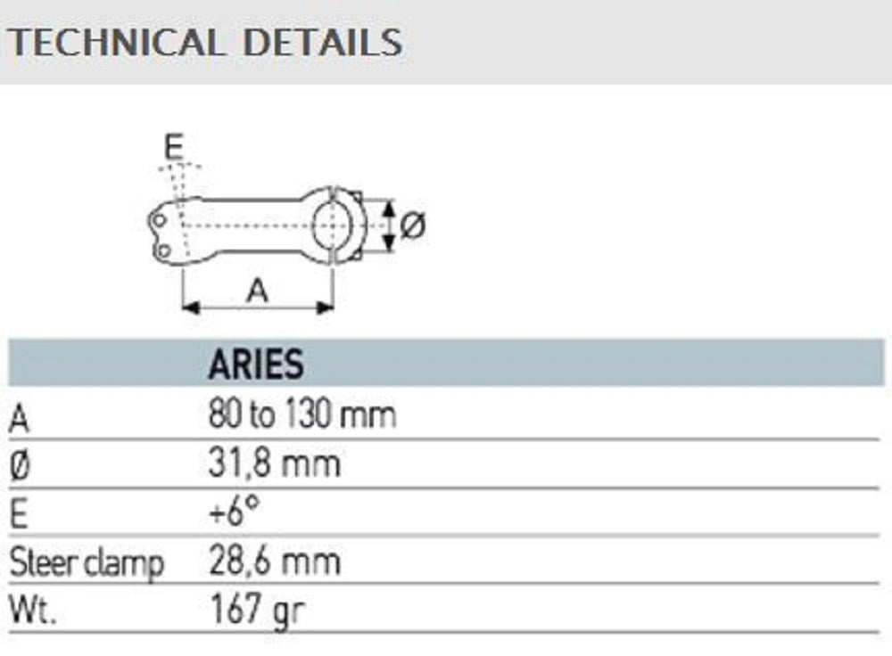 Sizes range from 80 to 130 mm with a 6 degree drop. Clamp size for the handle bar is 31.8. The graphics match Aries handlebar World class performance from ITM.
