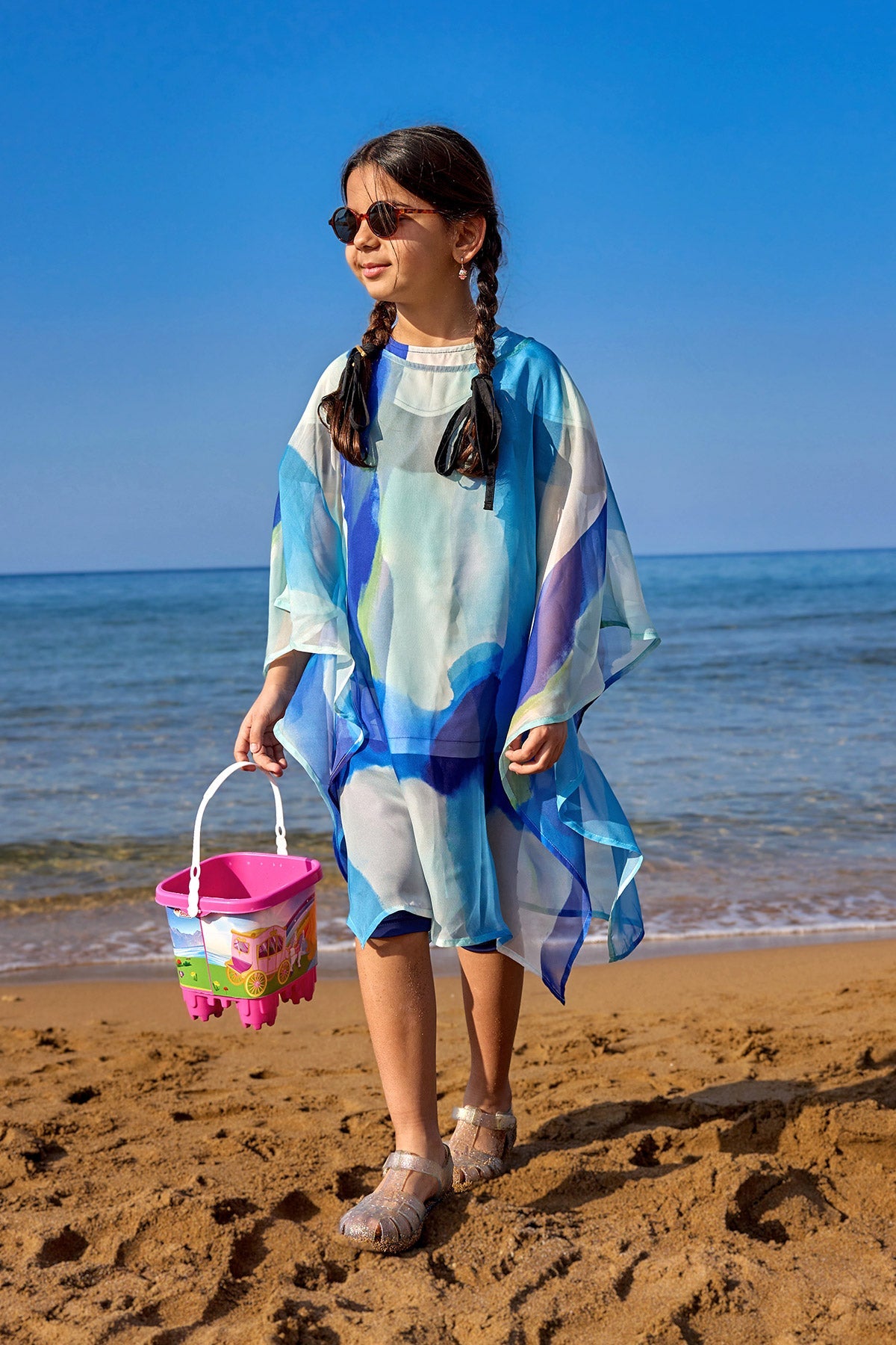 The CP2501 model enhances girls’ beachwear style with vibrant blue hues and abstract patterns. Its airy texture provides maximum comfort, while the relaxed silhouette allows ease of movement throughout the day. The flowing fabric gently filters sunlight, offering both protection and a contemporary look. When paired with the matching swimsuit, it creates a perfectly coordinated beach outfit.