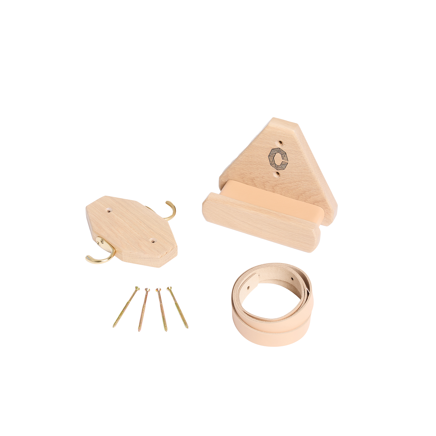 This is designed to display a board with the bottom facing outward. The tail rests on the wooden block, and the leather strap is adjustable to hold the board firmly in place.