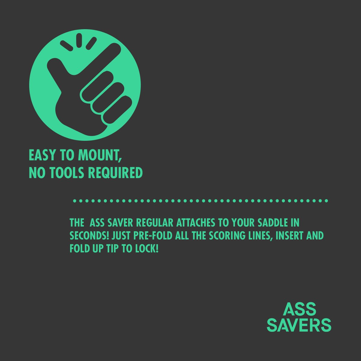 The latest Ass Saver sports the new FLIP-TIP™ attachment system. Once fitted, simply fold up the tip of the Ass Saver and it will securely lock to the saddle rails.