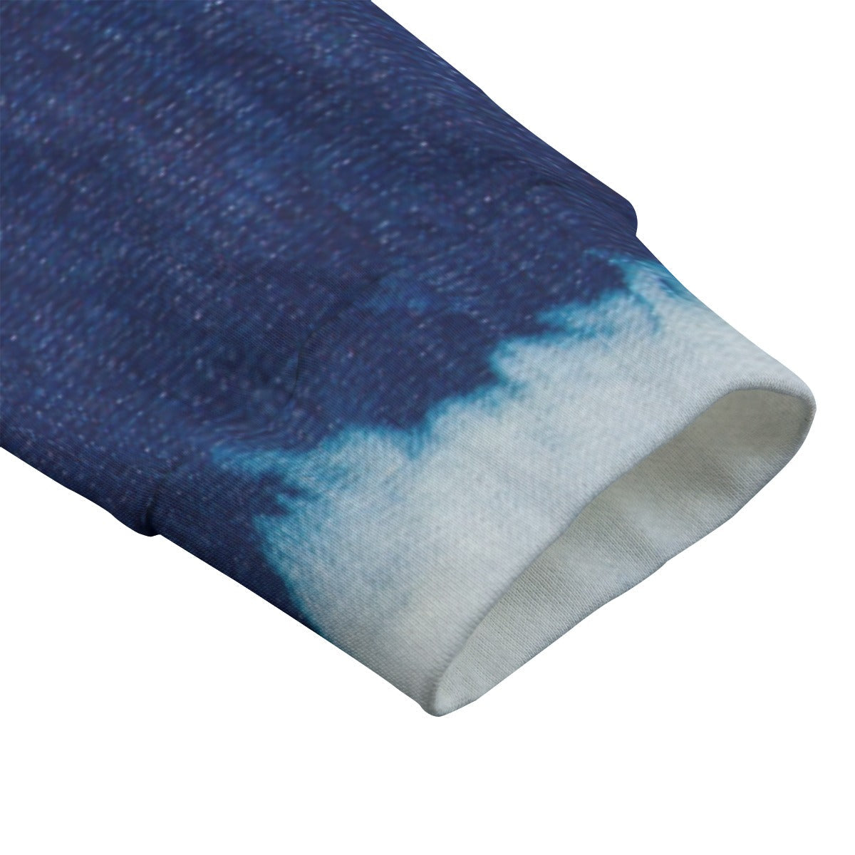 Denim print zip-collar sweatshirt for those days you want to be casual and be in pajamas at the same time. Vibrant ombre dye print will lighten up any room. This version has a little pop of color on the collar.
