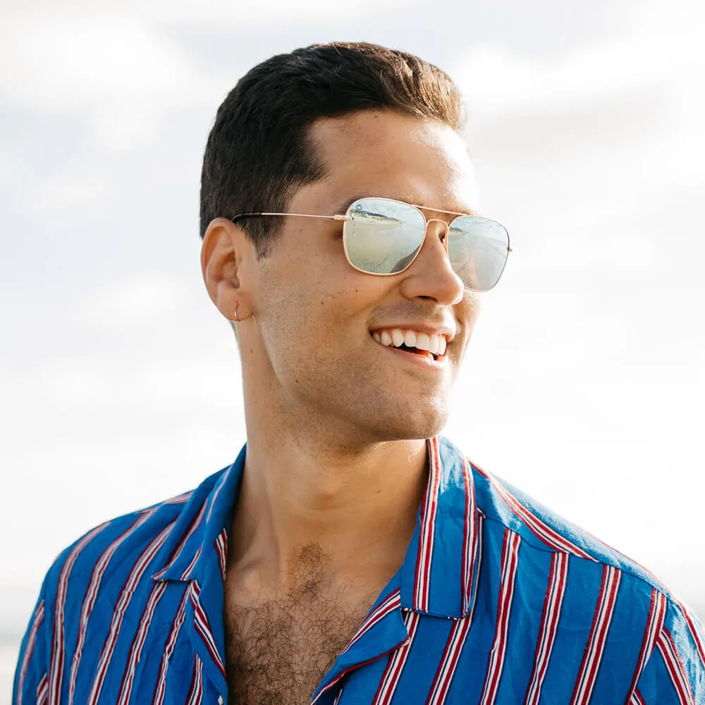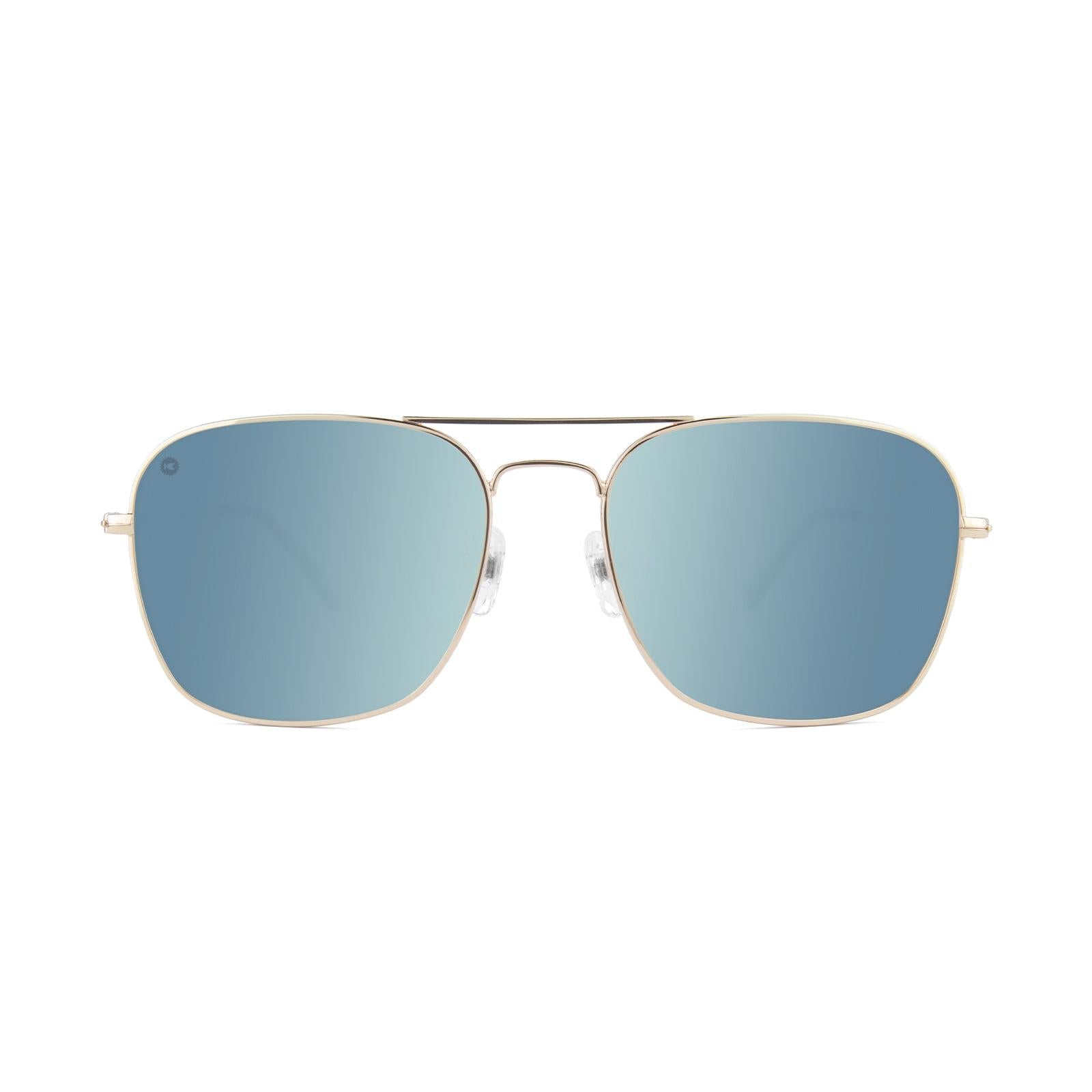 The sky on a cloudless day, a calm tropical ocean, enormous frozen glaciers blue is the color of magic and mystery, and these Mount Evans square-shaped aviator sunglasses with sky blue mirrored lenses reflect just that. Gold frames enhance and define these shades that feature silicone nose pads for extra comfort and tortoise shell rubber detailing for a more secure fit. Wherever your adventures take you, these sunglasses are ready for the job.