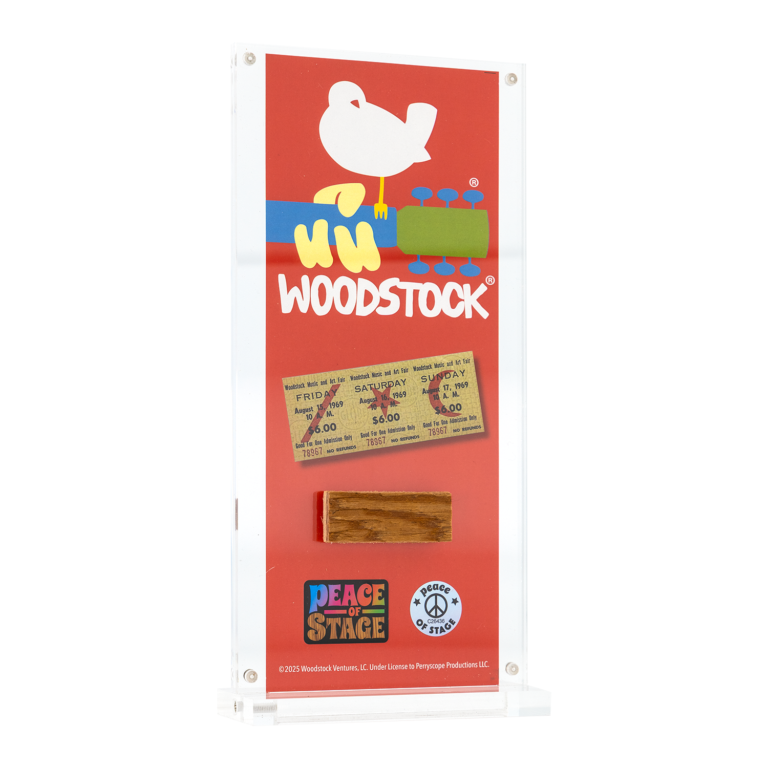 At the heart of this plexiglass is an authentic piece of the original 1969 Woodstock stage—the very platform where legendary artists performed their unforgettable sets. Each banner includes a certified ‘Peace of Stage’ wooden piece, making it a truly unique and meaningful keepsake for music lovers, collectors, and Woodstock enthusiasts.